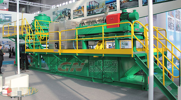 本屆石油展我們推出了一款鉆屑處理系統。該系統包括一個立式巖屑甩干機,一個高速離心機,雙螺桿泵和兩個正壓控制系統。該系統是綜合我們大量客戶的實際要求而設計的標準化鉆屑處理系統,可以為客戶處理不同工況下的水基泥漿和油基泥漿。