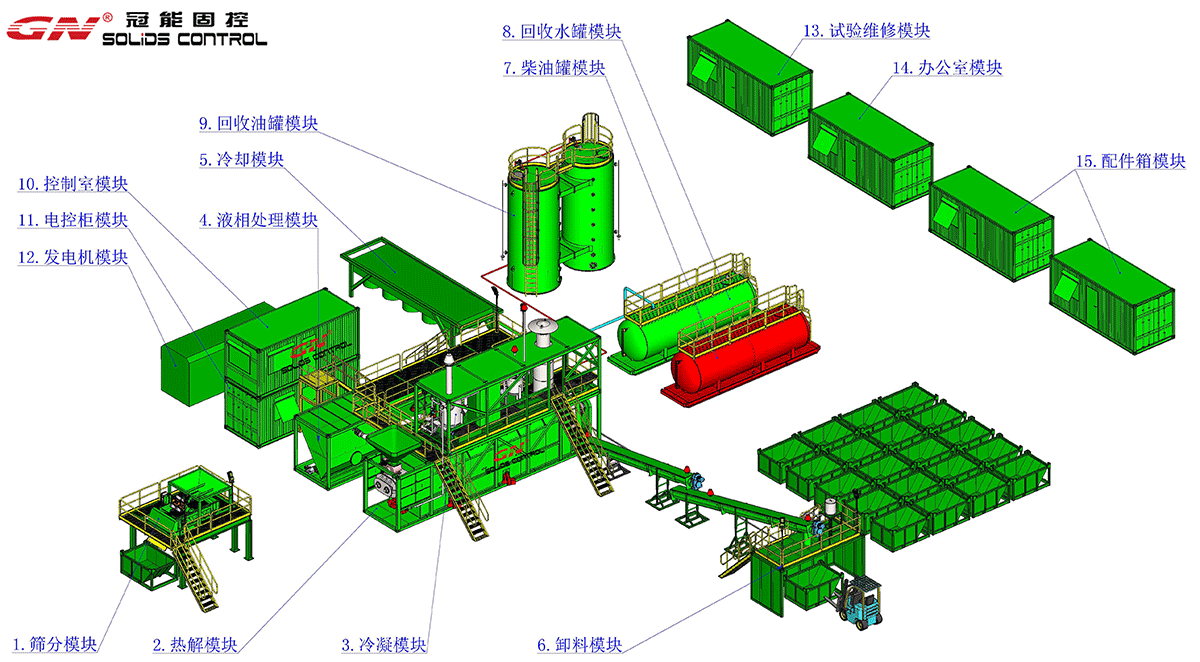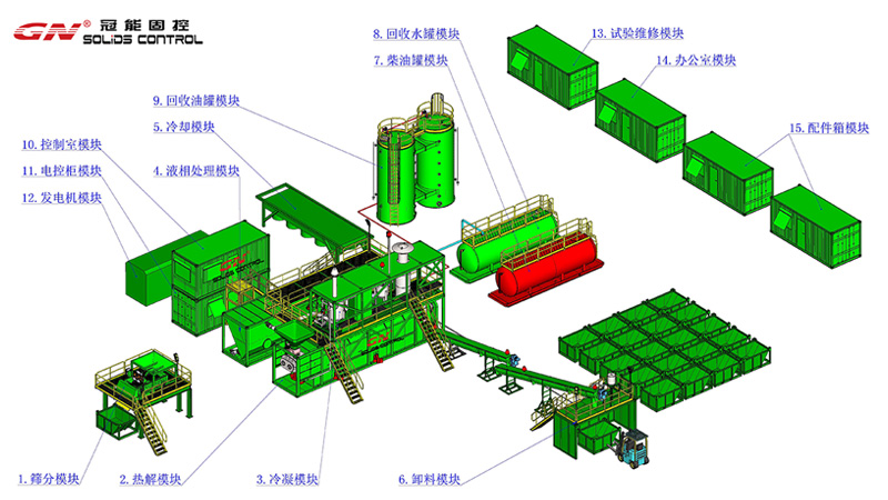 型號 GNTDU-35A 處理量 3.5 - 5.0 噸/小時 處理完固體含油量 0.3%-1%依據(jù)用戶需求 主要模塊單元 篩分模塊、熱解模塊、冷凝模塊、液相處理模塊、冷卻塔模塊、卸料模塊、柴油罐模塊、